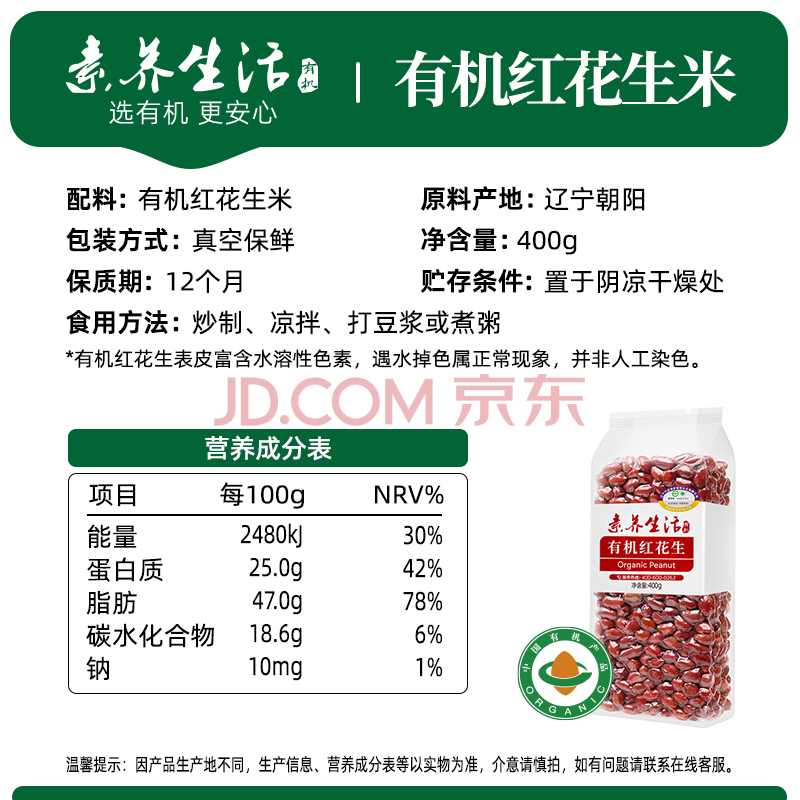 商品相册:素养生活有机红花生400g 生花生米 花生豆 花生仁 东北四粒红 凉拌油炸第1张/共8