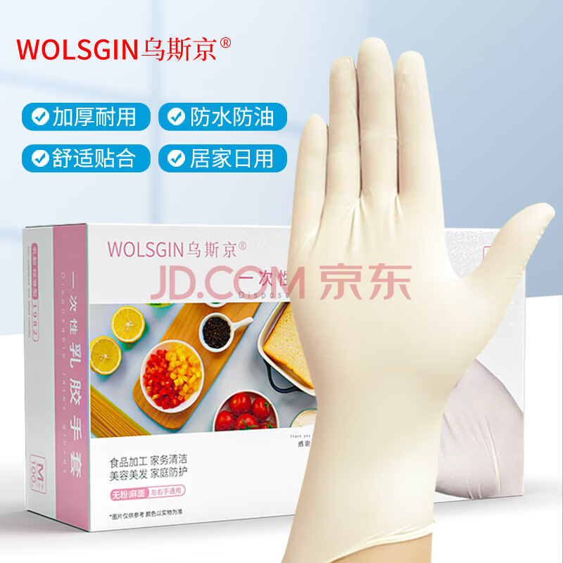 商品相册:乌斯京(WOLSGIN)一次性手套 乳胶手套100只M中号 橡胶食品级餐饮加厚高弹检查手套第