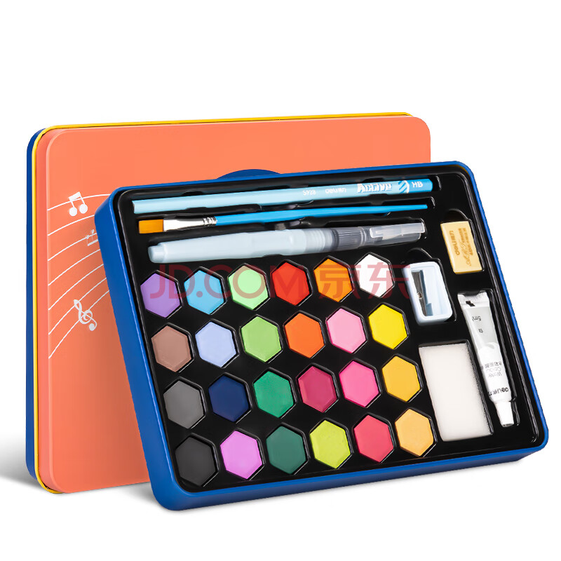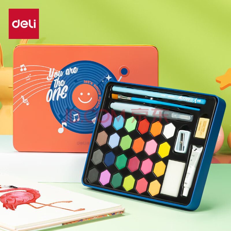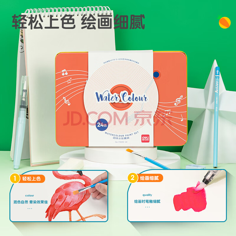 商品相册:得力(deli)固体水彩24色水彩颜料套装含画笔自来水笔绘画彩绘铁盒装学生涂鸦女孩儿童礼物第