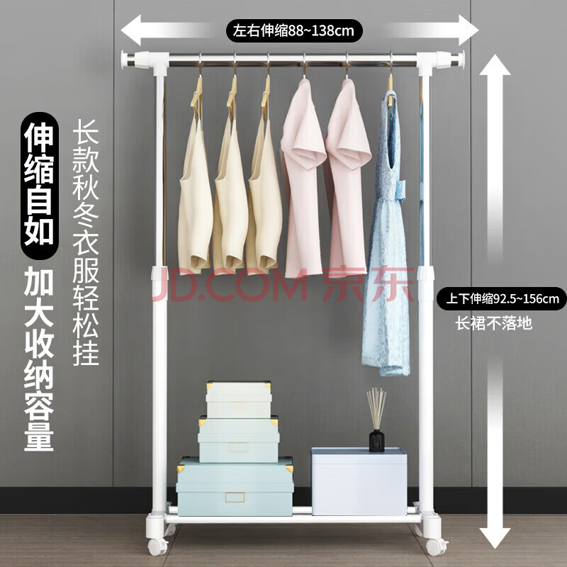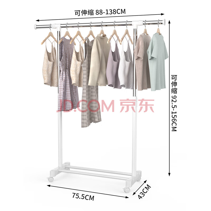商品相册:欧润哲单杆双向伸缩晾衣杆落地衣帽架移动晾衣架阳台卧室挂衣架88-138CM第