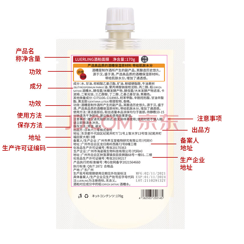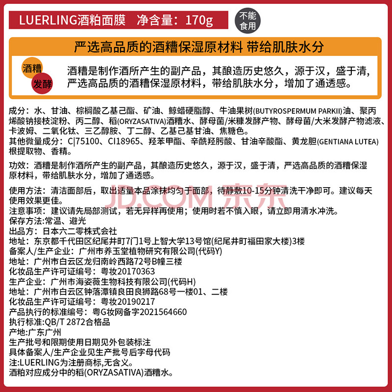商品相册:LUERLING酒糟酒粕涂抹面膜170g面部保湿补水日本进口酒粕酵母第