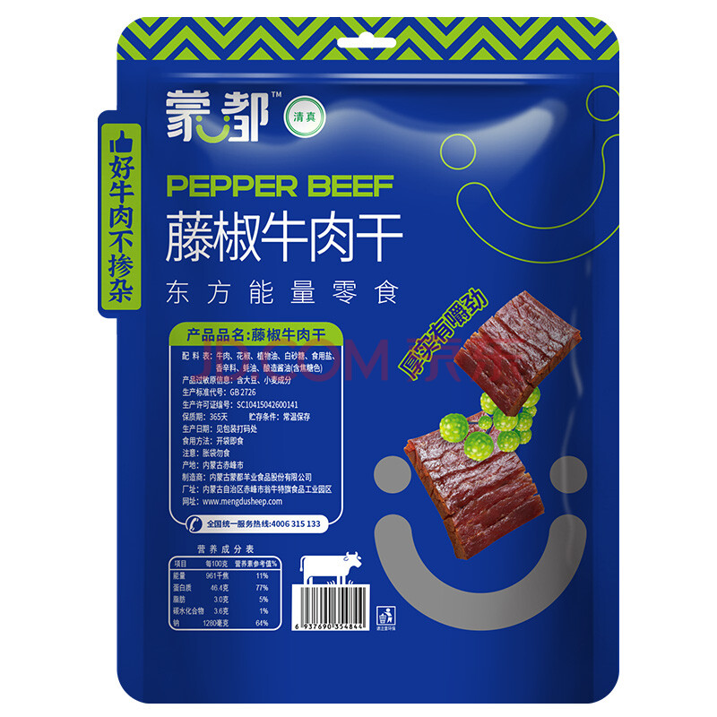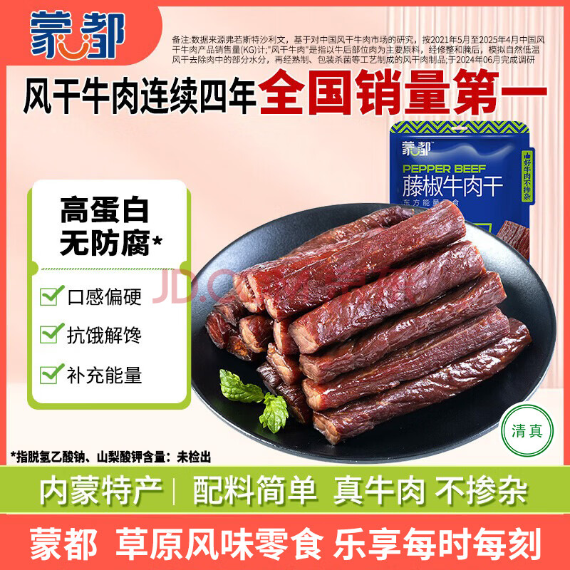 商品相册:蒙都 风干牛肉干 藤椒味488g 约七成风干 袋装 休闲零食 肉干肉脯清真第
