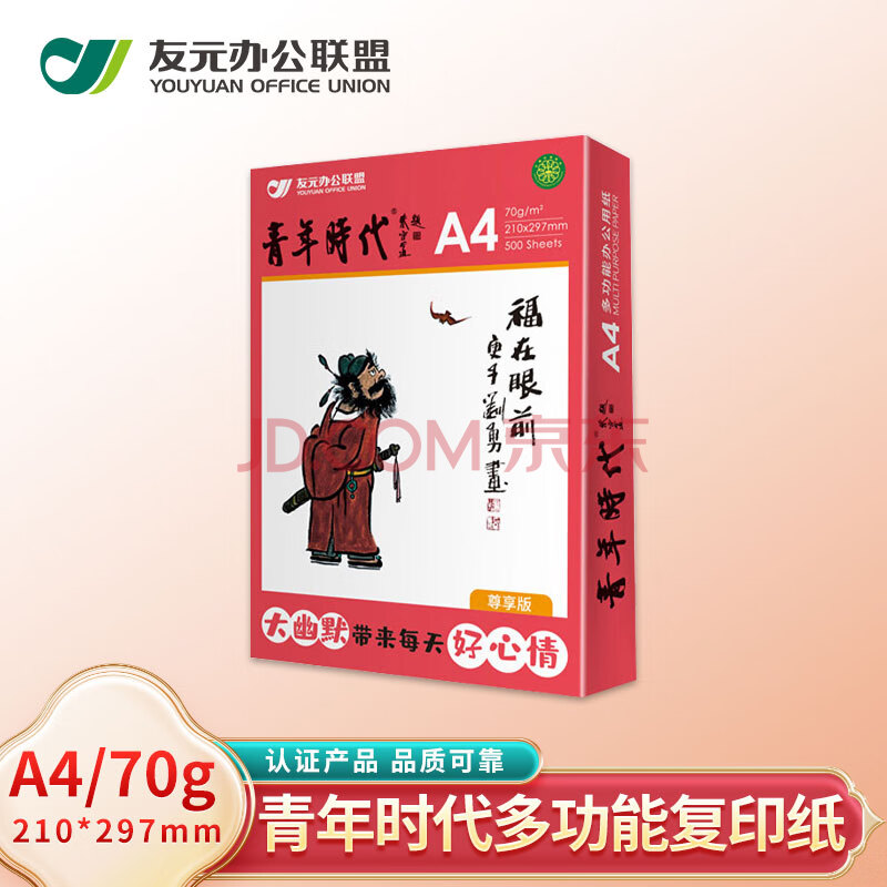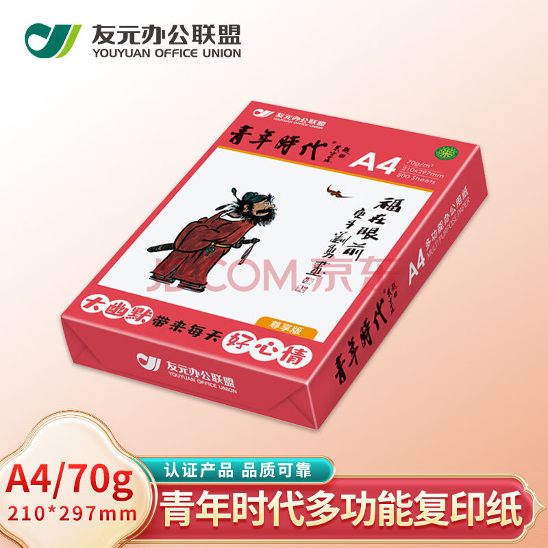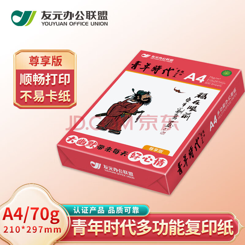 商品相册:友元 青年时代 70克A4 双面打印纸 热销复印纸 500张/盒 单包盒 (共计500张)办公联盟优选第