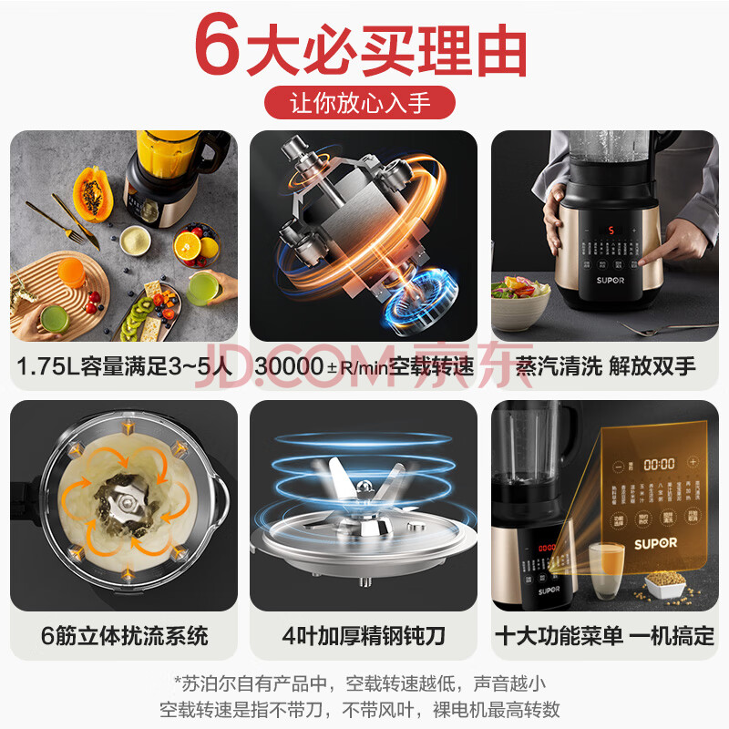 商品相册:苏泊尔(SUPOR)破壁机 1.75L大容量家用多功能可预约辅食料理机 加热免滤全自动豆浆机 破冰碎冰榨汁机SP503A第