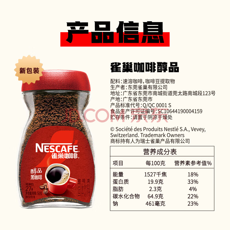 商品相册:雀巢(Nestle)醇品速溶美式黑咖啡粉0糖0脂*健身燃减防困瓶装50g第1张/共4