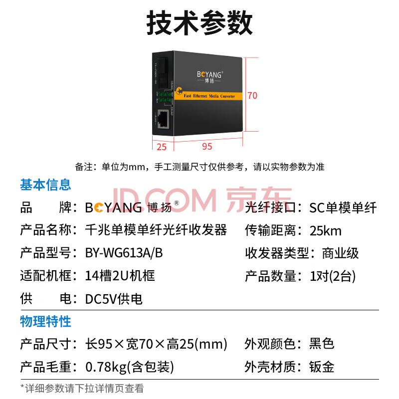 商品相册:博扬(BOYANG)千兆单模单纤光纤收发器一对 单模光电转换器 光纤转网线 防雷SC接口 25公里外电BY-WG613A/B第