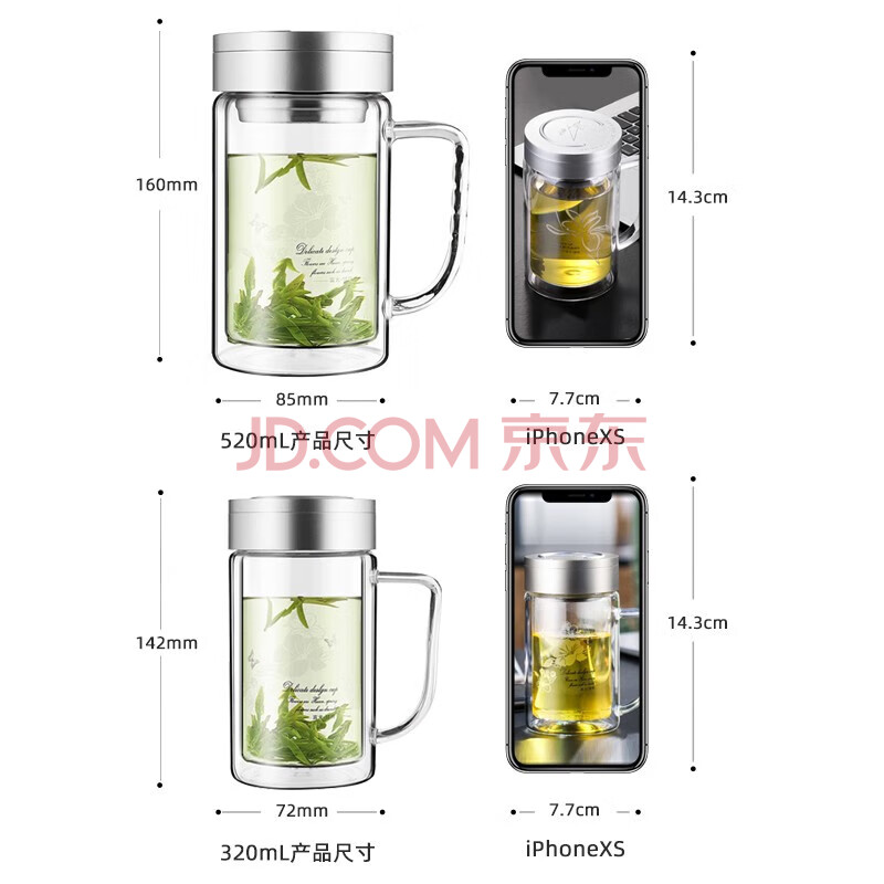 商品相册:富光双层玻璃杯商务泡茶杯子大容量耐热办公水杯过滤带把银色320ml第