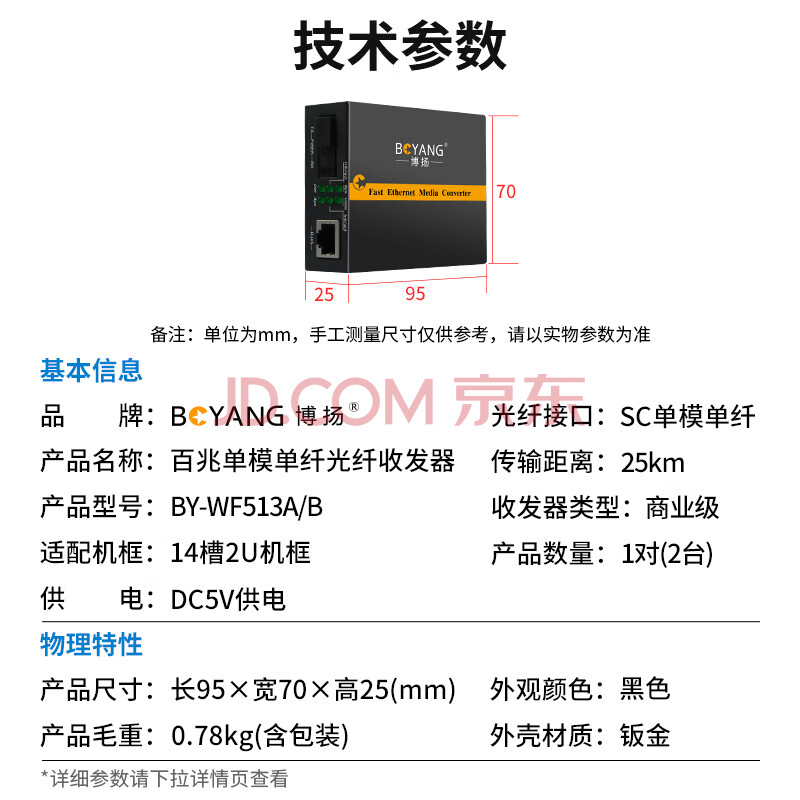 商品相册:博扬(BOYANG)百兆单纤单模光纤收发器一对 光电转换器 单模收发器 防雷SC接口 25公里外电 BY-WF513A/B第