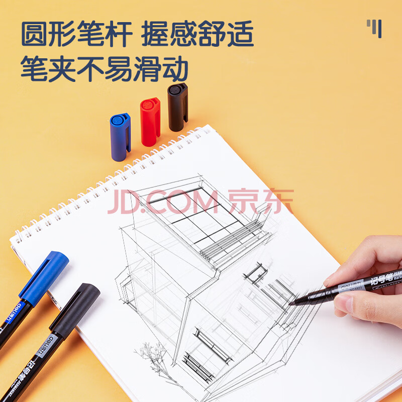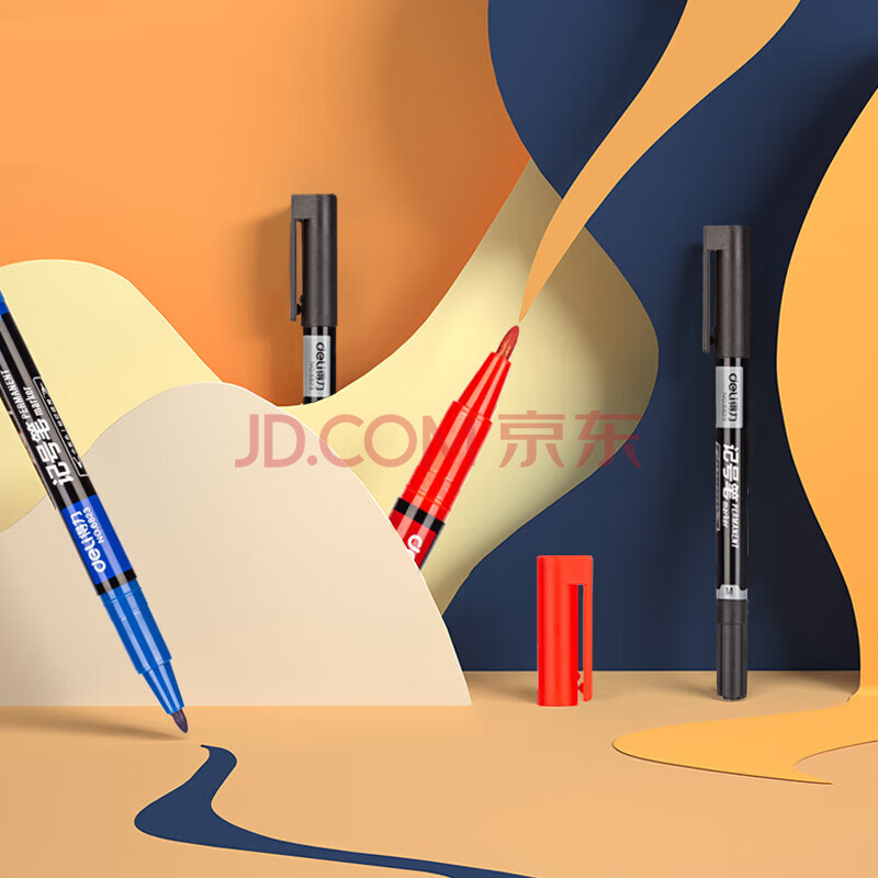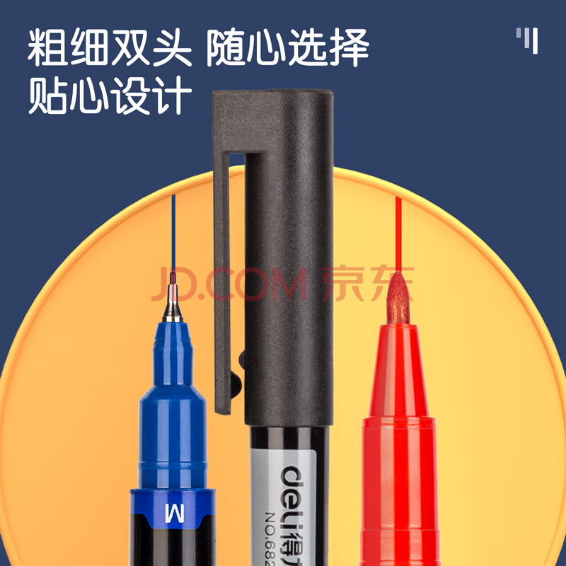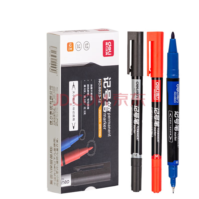 商品相册:得力(deli)0.5mm/1.2mm小双头记号笔会议签字 儿童学生马克笔勾线 混色6黑3红3蓝 12支/盒 6823第