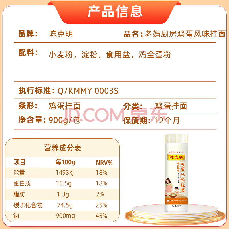 商品相册:陈克明面条 老妈厨房鸡蛋风味挂面900g 挂面炸酱面拌面拉面第1张/共8