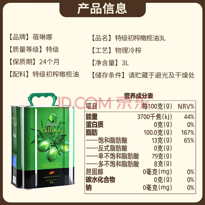 商品相册:蓓琳娜(BELLINA)【保真橄榄油】欧洲原装进口100%特级初榨橄榄油3L铁罐家食用炒菜第
