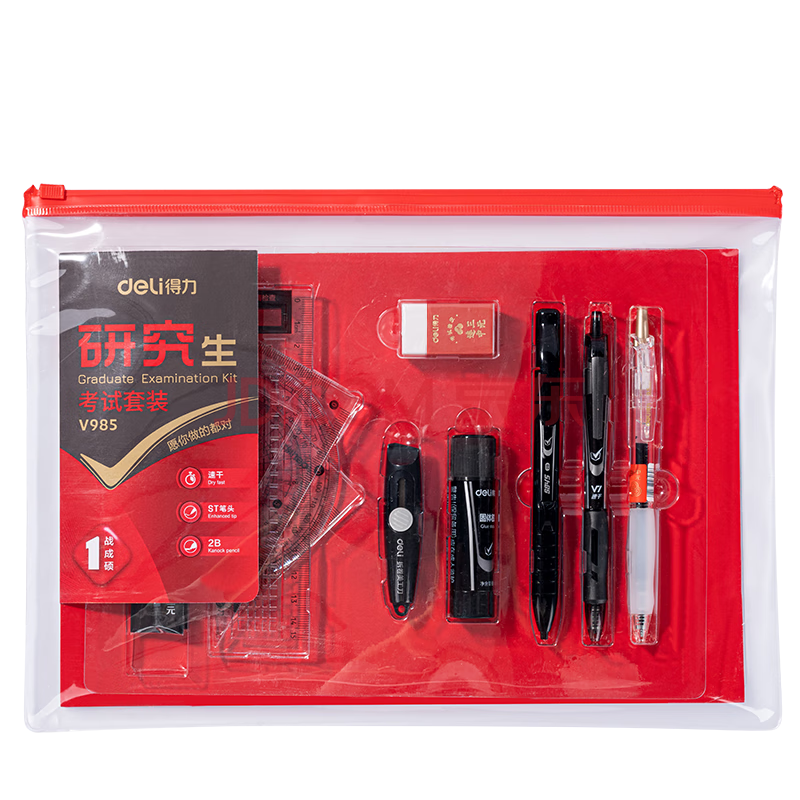 商品相册:得力连中三元考试套装13件套 绘图套尺+中性笔+笔芯+橡皮 答题卡2B涂卡笔铅笔 考试专用 考研套装V985第