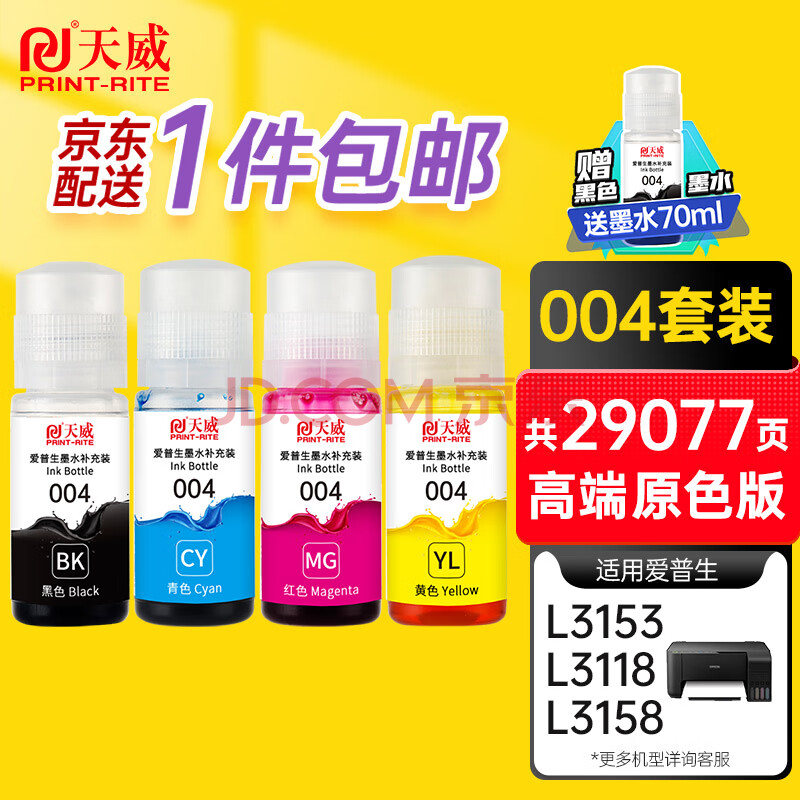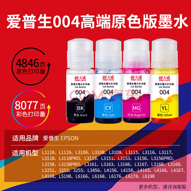 商品相册:天威004墨水适用爱普生打印机墨水L3251 L3255 L3258 L3256 3558 3556 3266 3153 3268 3158 3219 3253 1258四色第