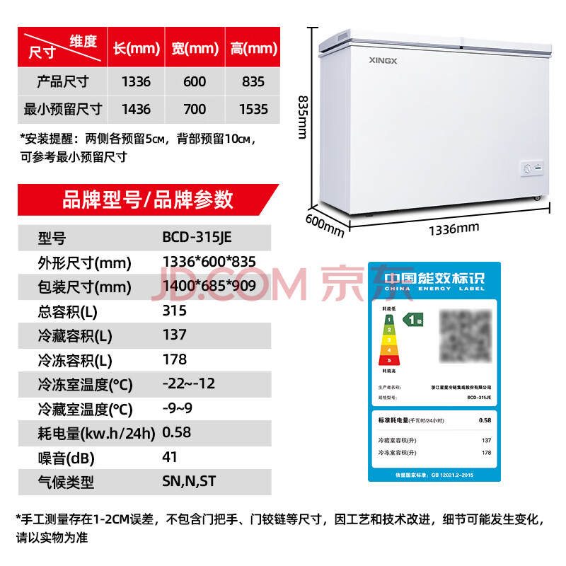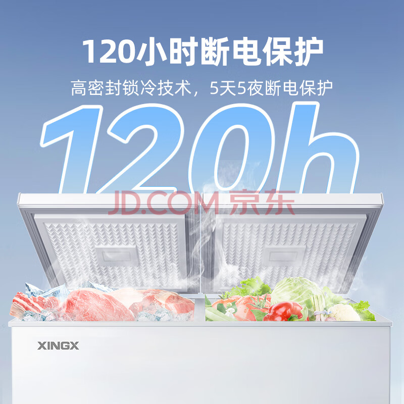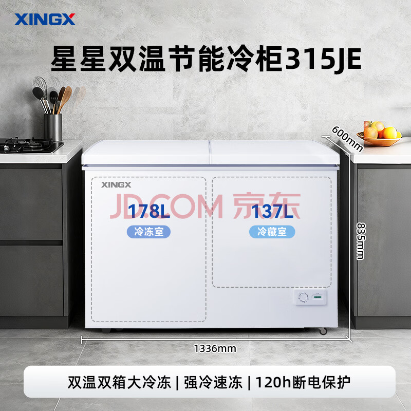 商品相册:星星(XINGX)315L双温家用卧式冰柜 大容量保鲜节能卧式冰箱 冷藏冷冻双温双箱减霜冷柜 BCD-315JE 第