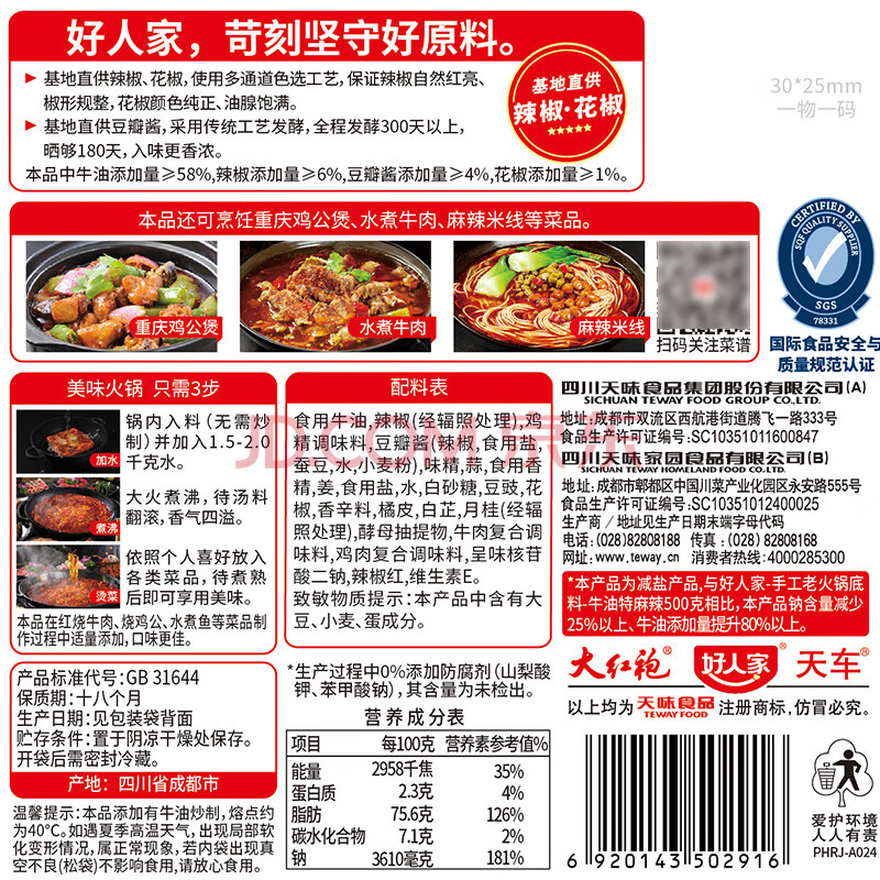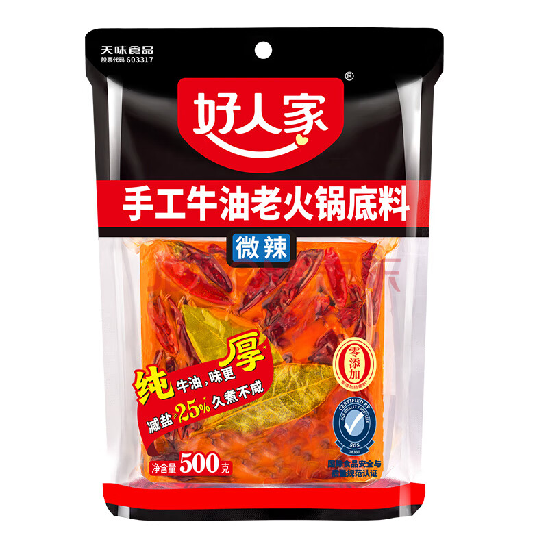 商品相册:好人家手工牛油老火锅底料500g微辣【减盐≥25%】冒菜麻辣烫方便调料第