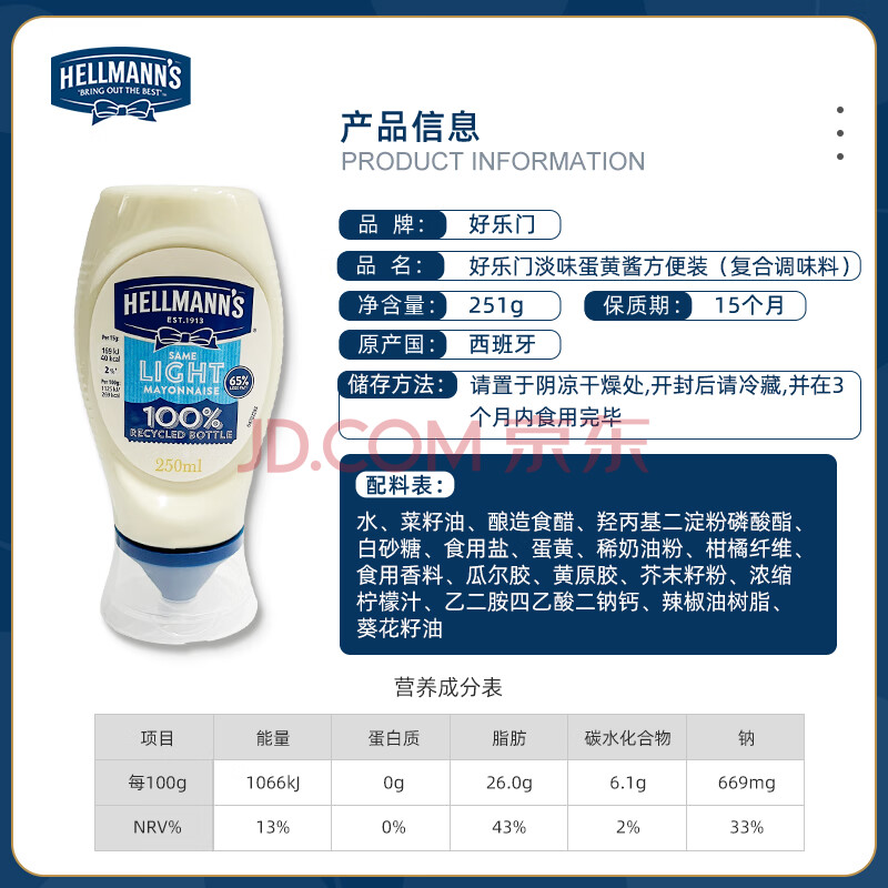 商品相册:好乐门Hellmanns 西班牙进口 淡味蛋黄酱 沙拉酱 美乃滋轻食烘培 251g第