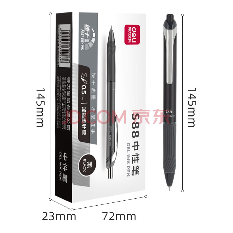商品相册:得力(deli)【抗摔小金刚】金属笔夹速干按动中性笔签字笔办公笔 0.5mmST头加强型针管 12支/盒黑色 S88第
