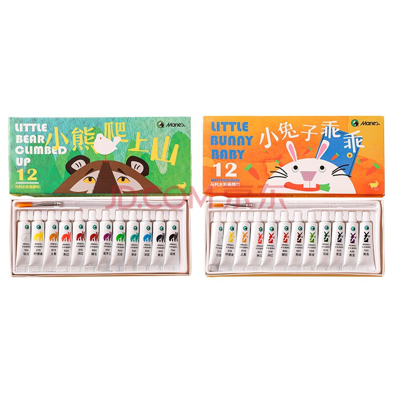 商品相册:【全网低价】马利(Marie's)水彩颜料盒装18色5ml 儿童水彩画卡通图案便携盒装小兔子乖乖自带画笔水彩颜料 初学适用 W1218美术写生第