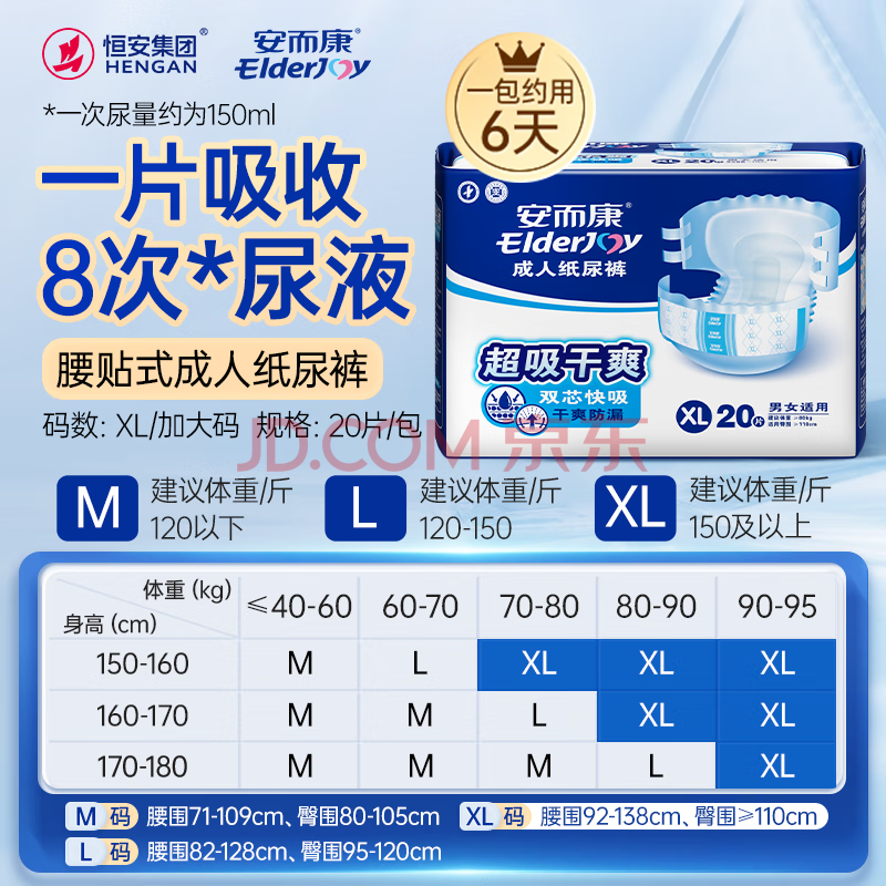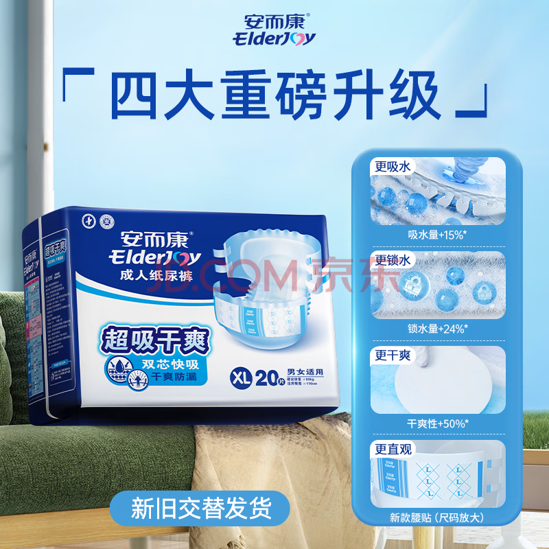 商品相册:安而康(Elderjoy)超吸干爽成人纸尿裤XL20片臀围>110cm成人尿不湿老人快吸防漏第