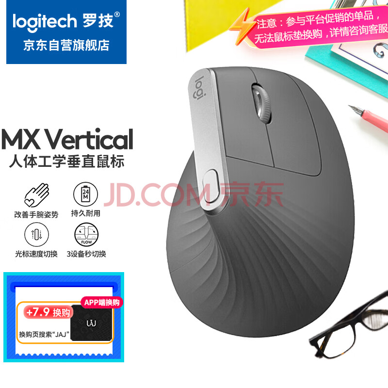 商品相册:罗技(Logitech)大师系列 MX Vertical 人体工学鼠标 垂直鼠标 无线蓝牙快速充电 带优联接收器 黑色第