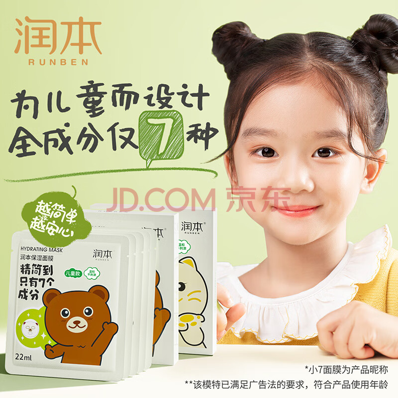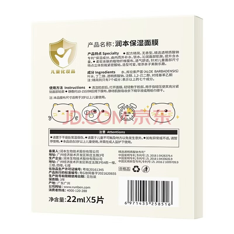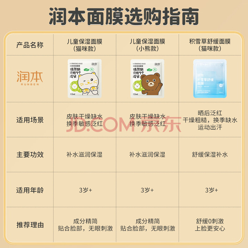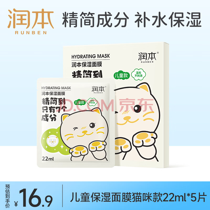 商品相册:润本儿童面膜5片*1盒3-6-12岁男童女童学生宝宝补水保湿面膜-猫咪款第1张/共8