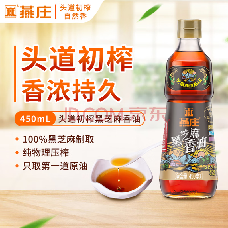 商品相册:燕庄 香油450ml【一级】头道初榨纯黑芝麻油 凉拌火锅油碟调味第
