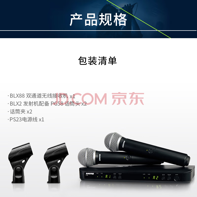 商品相册:SHURE舒尔 BLX288/PG58动圈手持无线麦克风一拖二K歌话筒 专业录音直播户外舞台演出会议第