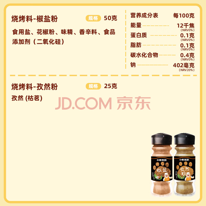 商品相册:小熊驾到 椒盐粉50g+孜然粉25g厨房烧烤调料火锅调料香料撒料羊肉串调味品第