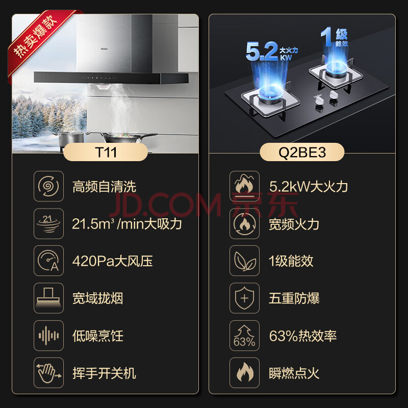 商品相册:海尔(Haier)抽油烟机 顶吸欧式21.5m3/min大吸力 挥手智控自清洁 油烟机灶具套装T11+Q2BE3(天)【套装商品】第1张/共5