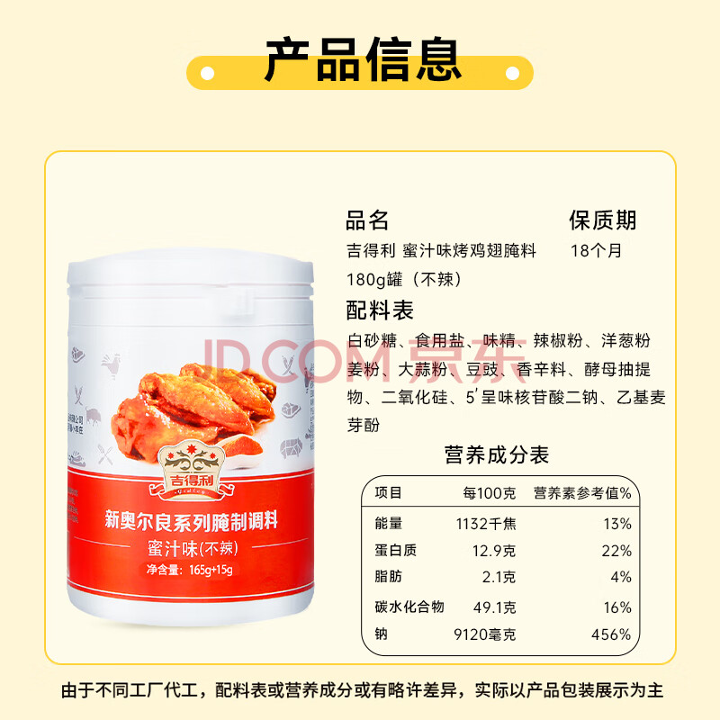 商品相册:吉得利蜜汁味烤鸡翅腌料180g 罐装 儿童烤肉炸鸡烤鸡翅烧烤料腌料调味料第