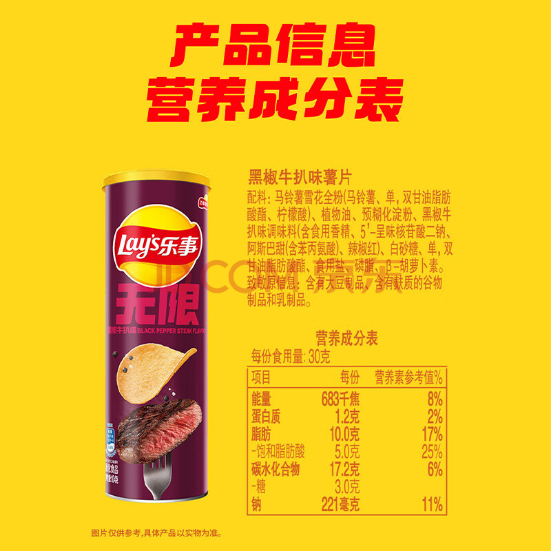 商品相册:乐事(Lay's)无限薯片 黑椒牛扒味 104g 罐装 膨化食品 零食 休闲食品第1张/共8