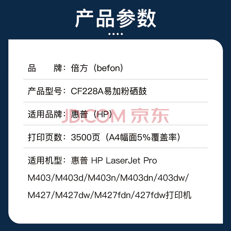 商品相册:倍方CF228A硒鼓 28a易加粉适用惠普m403d m427dw m427fdw m403dn M403dw M427fdn粉盒墨盒带芯片第