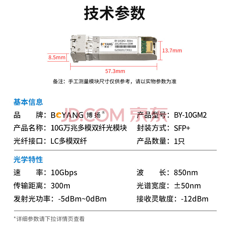 商品相册:博扬 BY-10GM2 SFP+光模块万兆10G多模双纤光纤模块(850nm,300m,LC) OMXD30000/SFP-XG-SX-MM850-A-D第