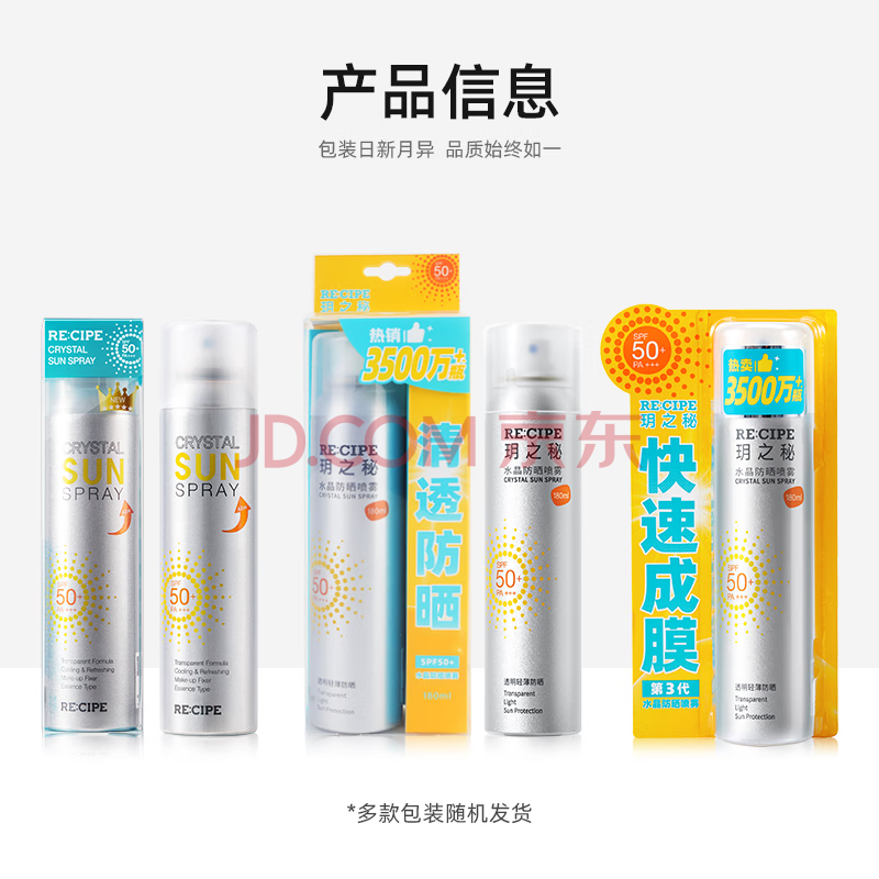 商品相册:RE:CIPE玥之秘水晶防晒喷雾360ml防水汗军训防晒喷雾防紫外线SPF50+第