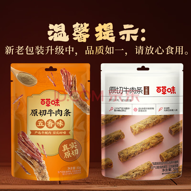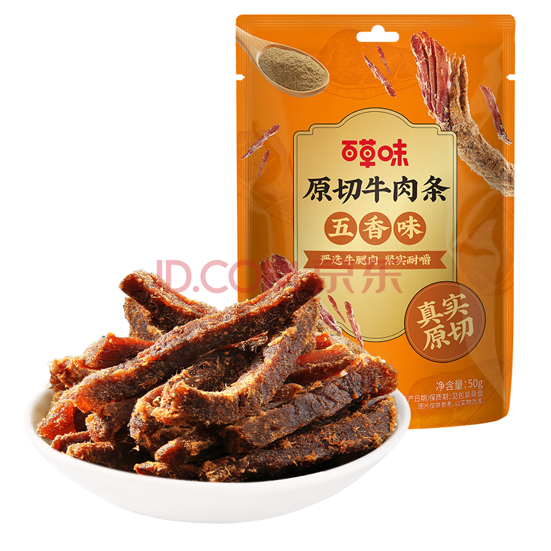 商品相册:百草味牛肉条五香味50g 肉干肉脯特产肉类小吃即食熟食 新老包装随机发第