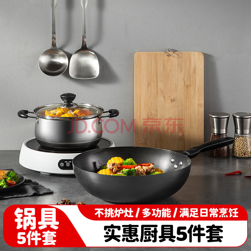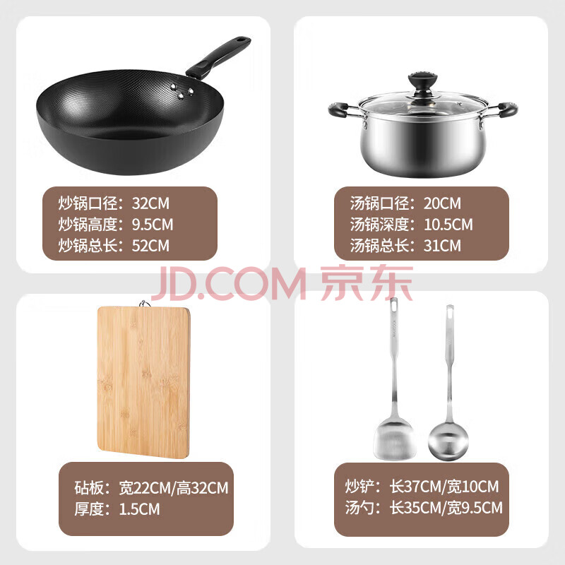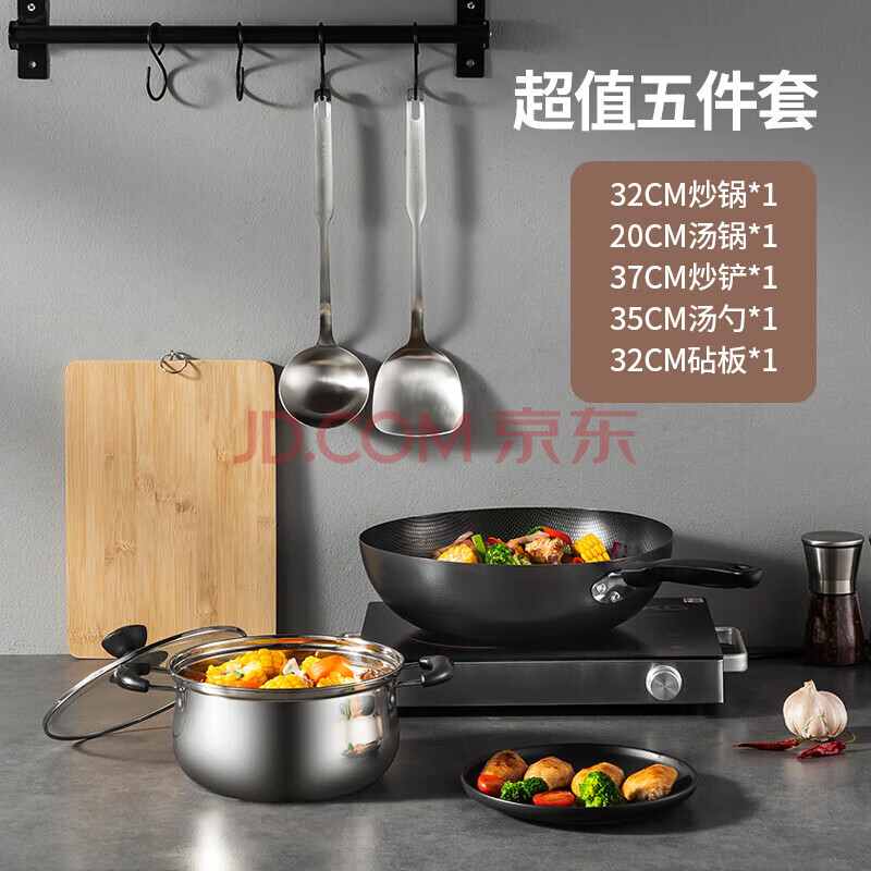 商品相册:美厨(maxcook)锅具套装 精铁炒锅汤锅砧板锅铲炒铲汤勺 厨具组合5件套 MCTZ4452第1张/共9