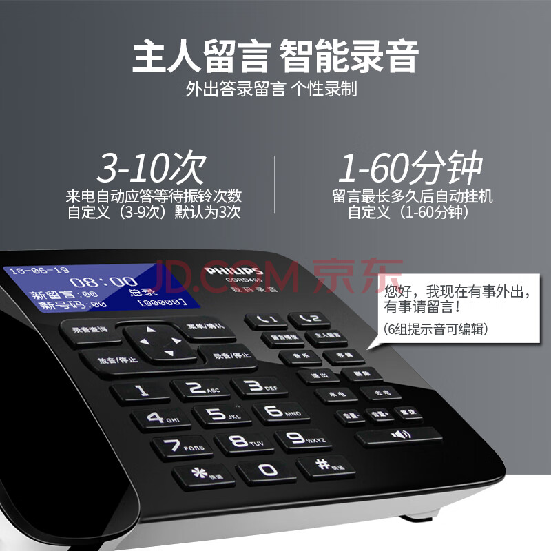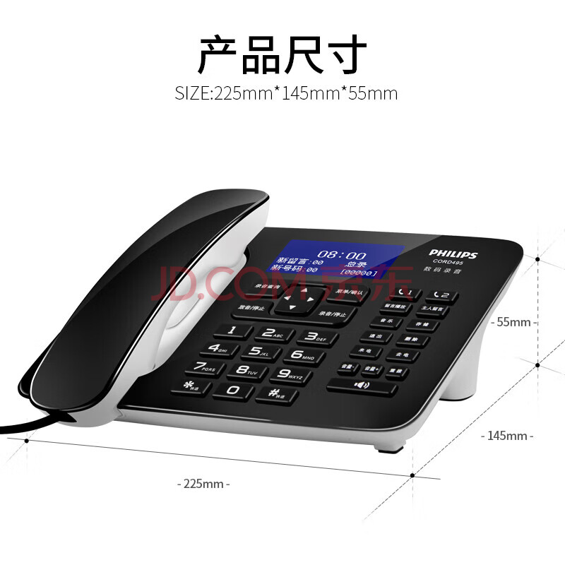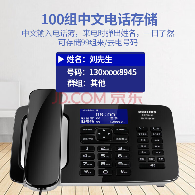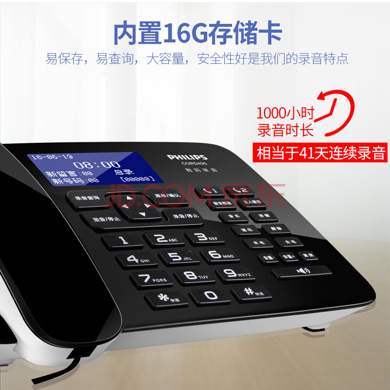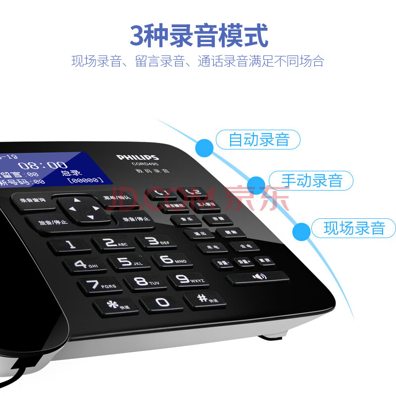 商品相册:飞利浦(PHILIPS)录音电话机 固定座机 办公家用 中文菜单 自动录音 可录音1000小时 CORD495黑色第
