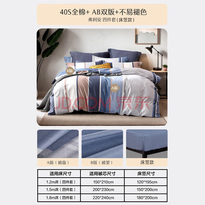 商品相册:水星家纺四件套床上纯棉100%全棉透气床笠被套双人1.8米x2米床弗利安家居馆第