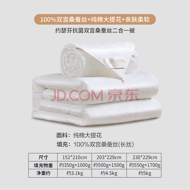 商品相册:富安娜双宫茧蚕丝被100%桑蚕丝子母被子冬季 双人加厚被芯10斤230*229cm第