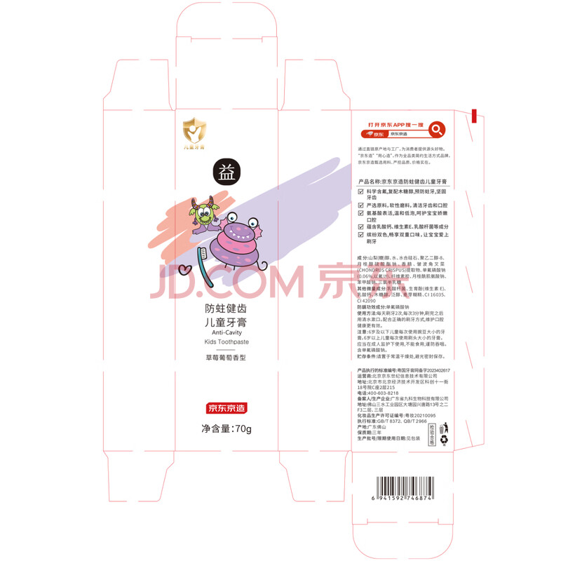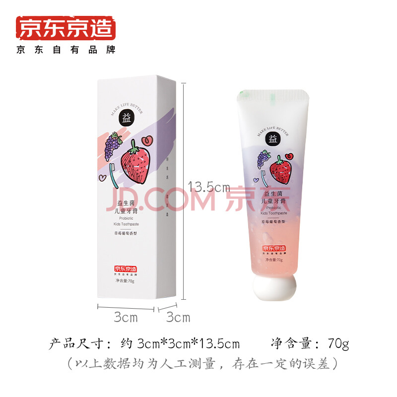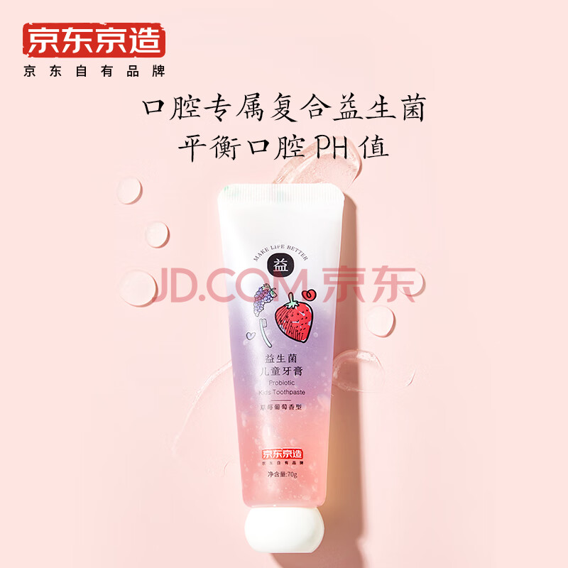 商品相册:京东京造 益生菌儿童牙膏 草莓葡萄70g 3-12岁适用 儿童防蛀护龈健齿 含氟第