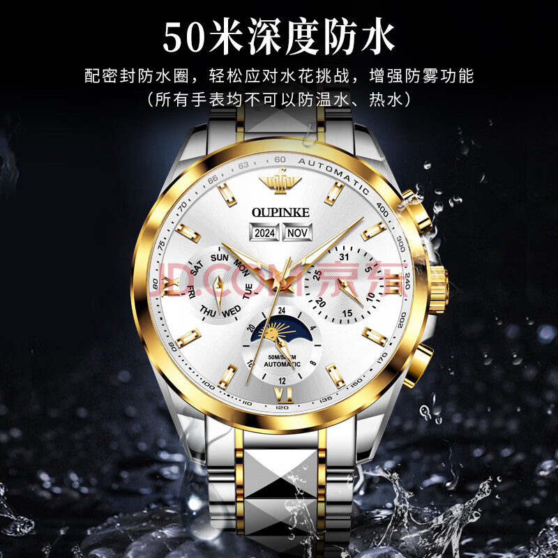 商品相册:欧品客瑞士认证品牌手表男机械表多功能日历月相夜光防水男手表生日礼物第