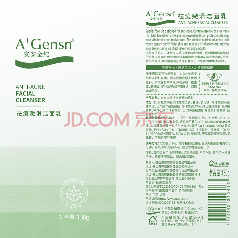 商品相册:安安金纯A'Gensn芦荟祛痘嫩滑洁面乳130g清洁毛孔补水保湿洗面奶第
