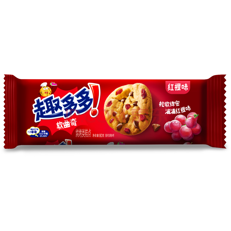 商品相册:趣多多 软式曲奇饼干点心 甜蜜红提味 80g 休闲零食 早餐下午茶第