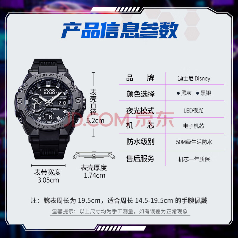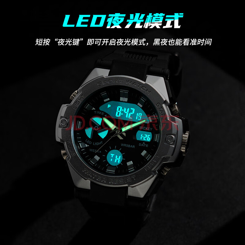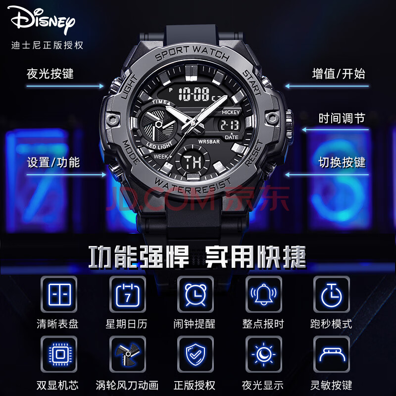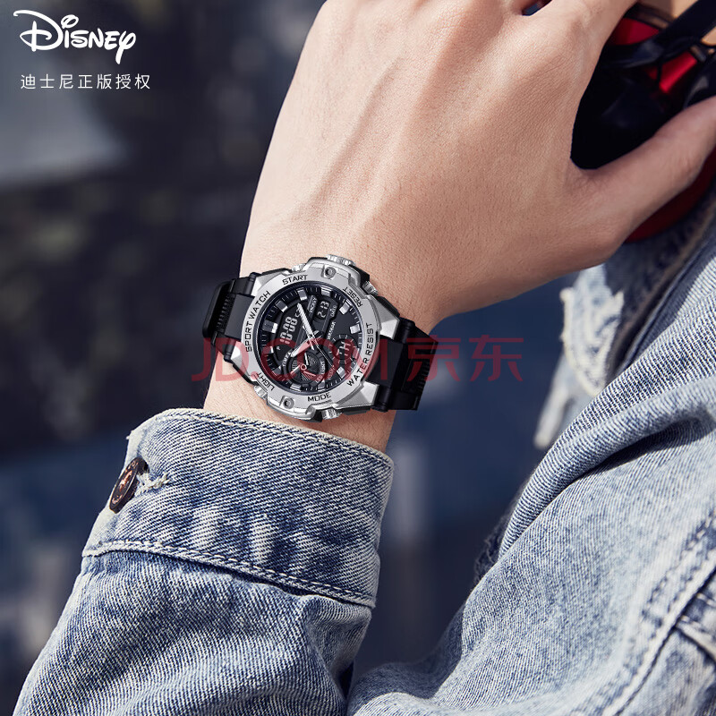 商品相册:迪士尼(Disney)手表男学生运动潮流青少年初高中生双显防水多功能电子表炫酷黑银第