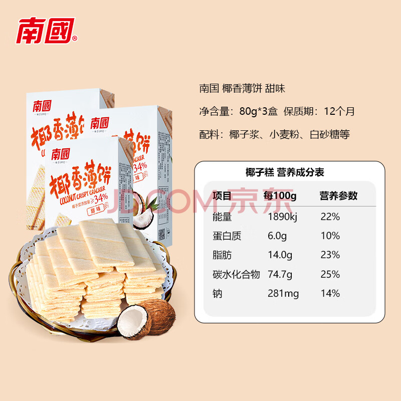 商品相册:南国 椰香薄饼甜味80g*3盒 薄脆椰子饼干海南特产休闲零食独立包装第