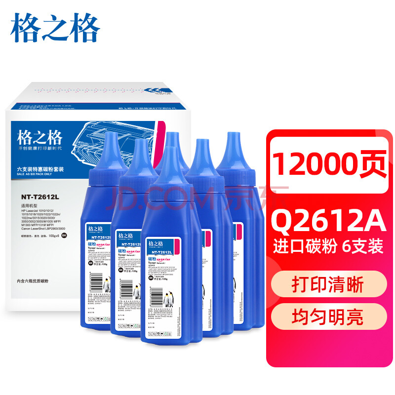 商品相册:格之格2612a硒鼓碳粉6支装 适用惠普m1005碳粉 惠普1020硒鼓 1010 3030 3050 1018佳能lbp2900打印机墨粉第