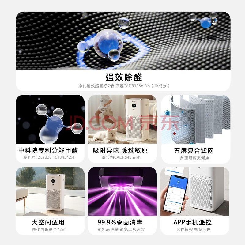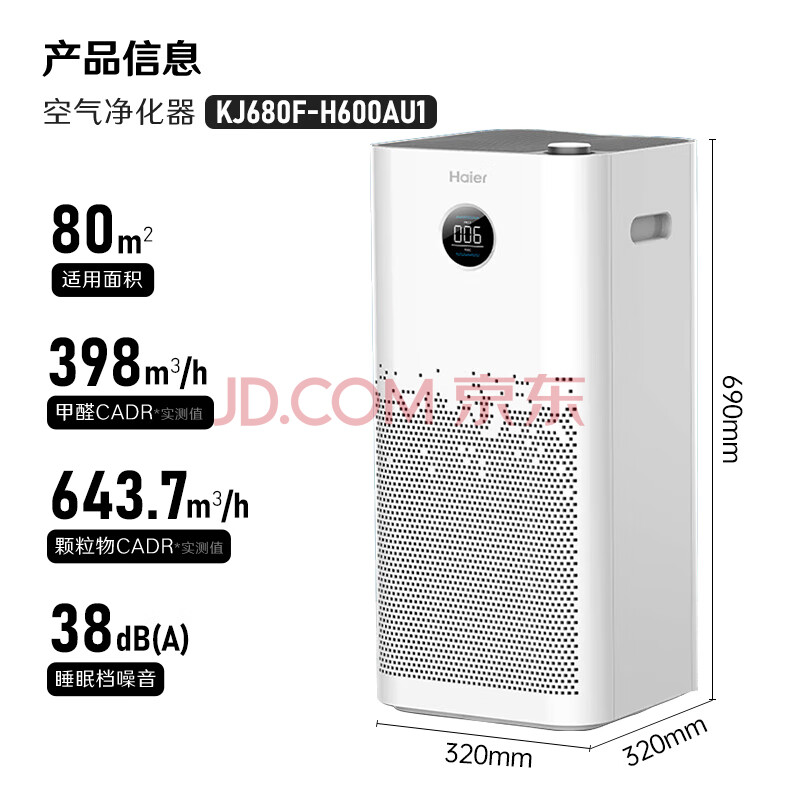 商品相册:海尔(Haier)空气净化器家用除甲醛雾霾颗粒物负离子UV杀菌氨基酸除醛消毒机甲醛数显KJ680F-H600AU1第1张/共6