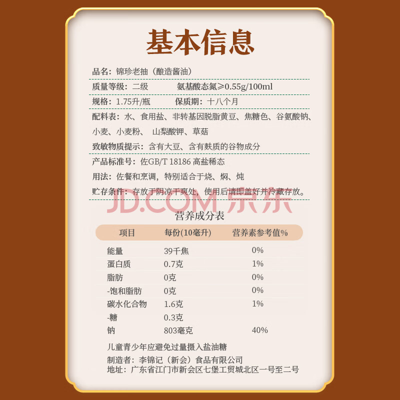 商品相册:李锦记 锦珍系列 锦珍老抽1.75L 自然红润 草菇添味 专业红烧 酱油第