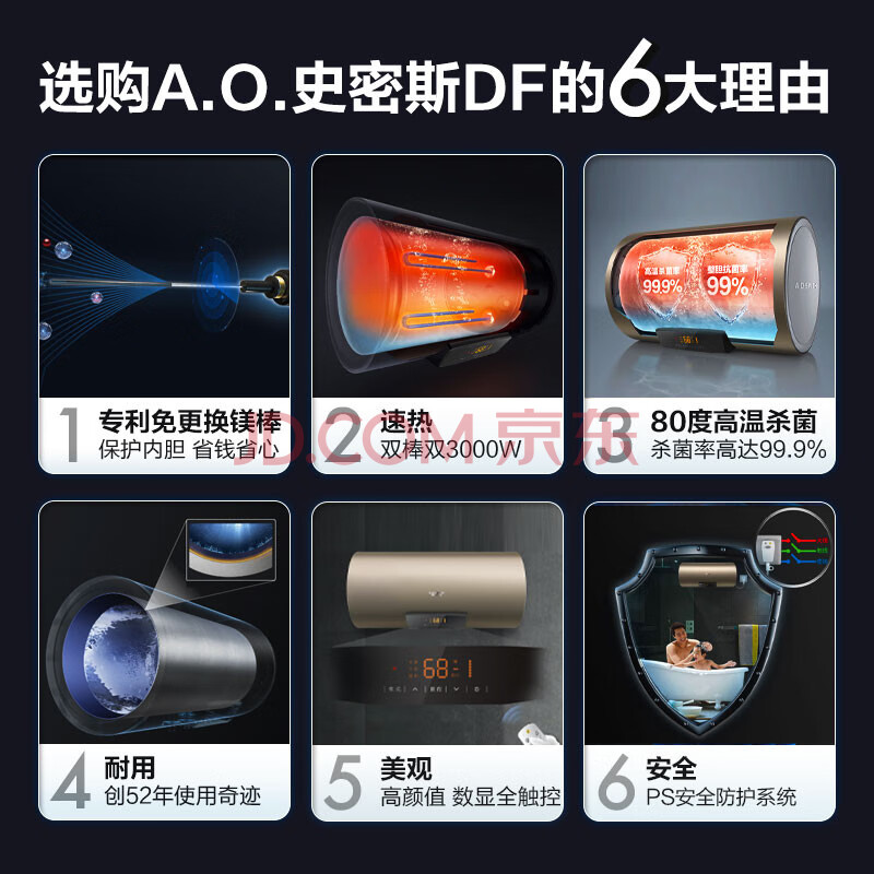 商品相册:史密斯(A.O.SMITH)80升电热水器 专利免更换镁棒 晶彩外观 金圭内胆8年包换 双3kW速热E80MDF 一级能效*第