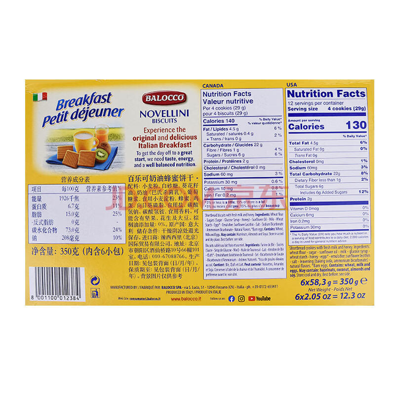 商品相册:百乐可 奶油蜂蜜饼干350g 意大利进口休闲零食下午茶糕点点心第